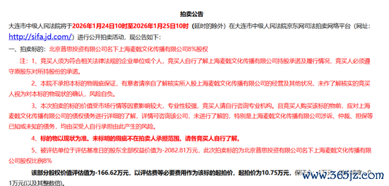 公告显现,该部分股权价值评估值为-166.62万元,以评估费等必要用度当作该想法起拍价,起拍价为10.75万元,保证金1万元,增价幅度0.1万元。